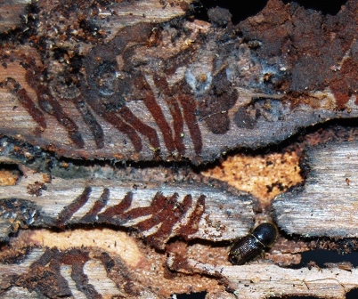 - Мелкие отверстия и выемки на поверхности древесной коры также могут свидетельствовать о наличии короеда-типографа. Насекомое изготавливает эти отверстия для откладки в них яиц и личинок.
